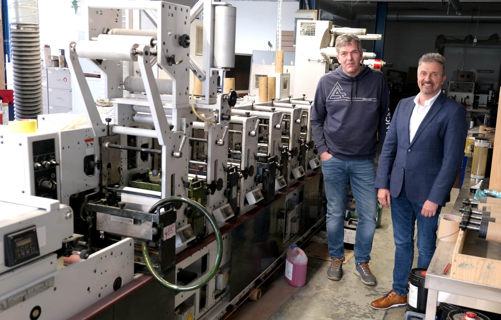 Stefan Detloff, Geschäftsführer HD Etiketten (l.) und Peer Boysen wurden sich schnell über den Kauf einer Rhyguan WON 330, die derzeit installiert wird, einig(Photo Credit: CO MICHAEL J.SCHERHAG)