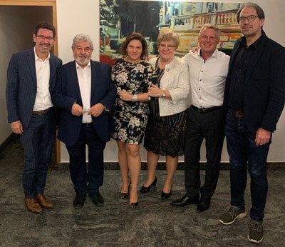 (V.l.n.r.): Dr. Michael Faller (Faller Packaging), Dr. János Karancsi, Dr. Lila Karancsi, Dr. Erika Karancsi (Pharma Print), Dr. Marcus Szukalski (Faller Packaging), Tilmann Wild (Faller Packaging) (Quelle: August Faller GmbH & Co. KG)