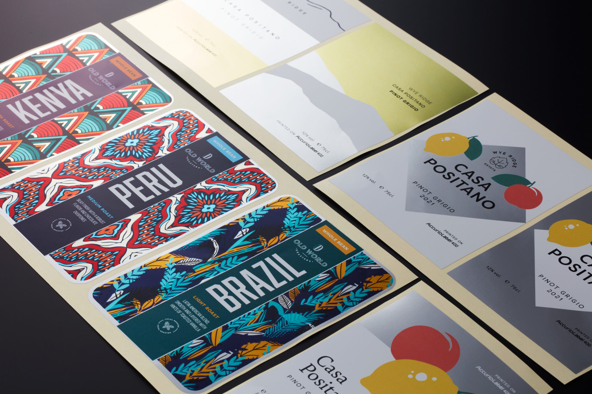 Beispieldrucke für Kaffee-Etiketten mit der Accurio Label 400 (Quelle: Konica Minolta)