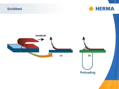 Erläuterung der Zusammenhänge und Notwendigkeiten anhand einiger Standardmessmethoden, beginnend mit den Schältests (FTM 1 + FTM 2) bei 90° und 180°-Abzug. Betrachtet man sich den Vorgang genauer (siehe Abbildung 1), kann man erkennen, dass wir alle behaupten, eine Kraft zu messen. Da jedoch in keinem Fall bei einem Haftklebstoff über eine scharfe Linie, sondern immer über eine Fläche abgezogen wird, entspricht die Messung physikalisch gesehen einem Druck (Kraft pro Fläche). Als „indirekte Größe“ hat sich die „Kraftmessung“ aber durchaus bewährt, man muss sich dessen nur bewusst sein. So bedeutet das Abheben (in Abbildung 1 ganz rechts), dass bereits eine Vorbelastung stattfindet, so dass je länger diese Strecke ist, desto scheinbar länger ist die Krafteinwirkung und desto scheinbar langsamer ist die Belastungsgeschwindigkeit. Üblicherweise resultiert aus einer geringeren Belastungsgeschwindigkeit ein niedrigerer Messwert. Dies spiegelt sich in den verschiedenen Messgeometrien wieder. Der 90°-Abzug wird immer ein etwas früheres Abheben bedingen und damit eine scheinbar geringere Belastungsgeschwindigkeit darstellen.