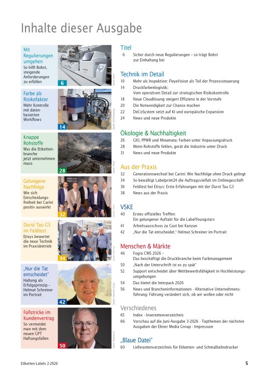 Mit Regulierungen umgehen: So hilft Bobst, steigende Anforderungen zu erfüllen +++ Farbe als Risikofaktor: Mehr Kontrolle mit datenbasierten Workflows +++ Knappe Rohstoffe: Was die Etikettenbranche jetzt unternehmen muss +++ Gelungene Nachfolge: Wie sich Entscheidungsfreiheit bei Carini positiv auswirkt +++ Durst Tau G3 im Feldtest: Etisys bewertet die neue Technik im Praxisbetrieb +++ „Nur die Tat entscheidet": Haltung als Erfolgsprinzip – Helmut Schreiner im Portrait +++ Fallstricke im Kundenvertrag: So vermeidet man mit dem neuen GPT Haftungsfallen- Download
